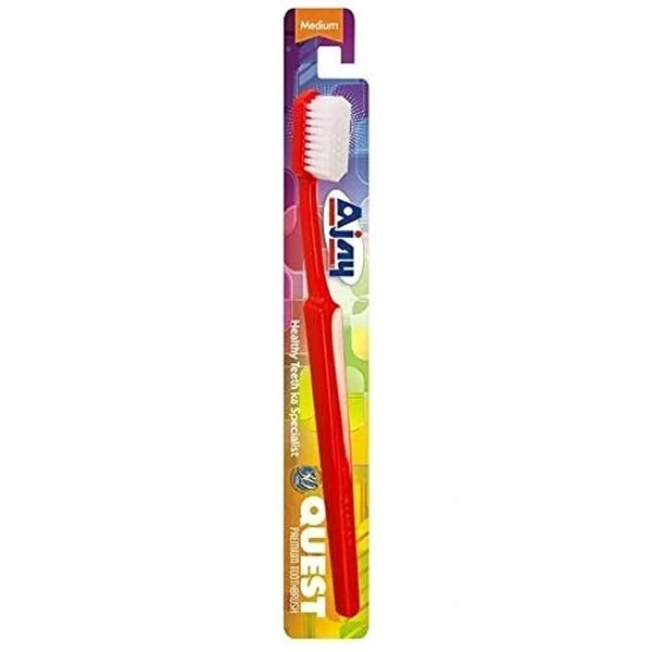 “AJAY QUEST” commonly refers to a type of toothbrush sold in India under the Ajay brand — not a toothpaste. It’s available in different bristle types like hard, medium, and soft, and is made for everyday oral hygiene/teeth cleaning.