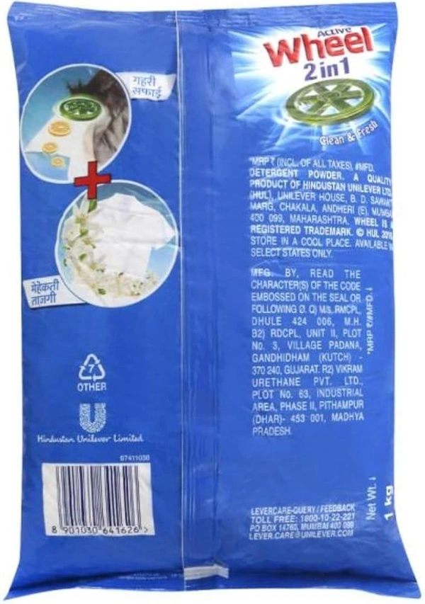 Wheel Active 2 in 1 Detergent Powder (500g) is a popular budget-friendly laundry detergent produced by Hindustan Unilever Limited (HUL). It is designed to combine deep cleaning with a fresh fragrance.